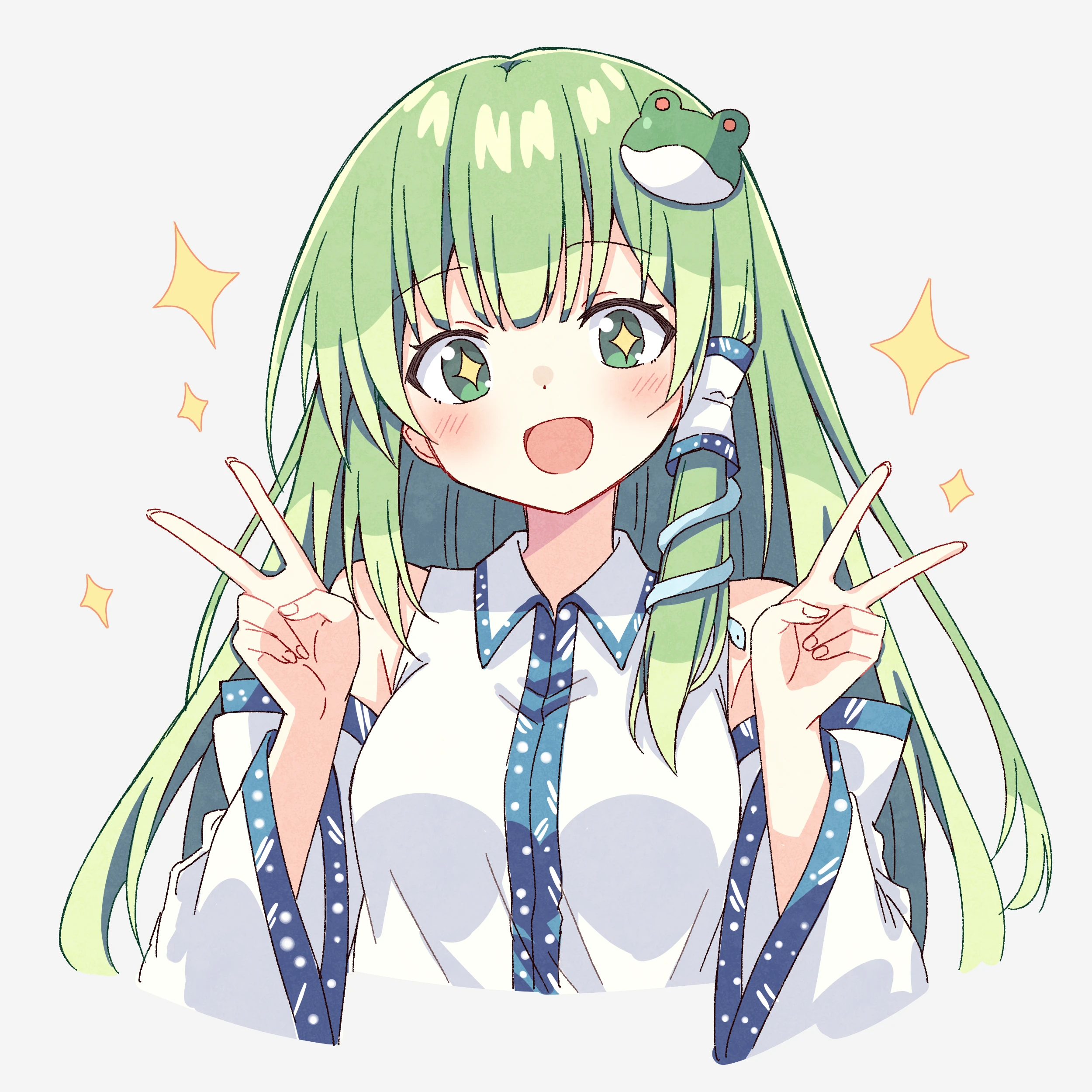 :d1boy1girlbare shouldersblushbreastscollared shirtcropped torsodetached sleevesdot nosedouble vfacing viewerfrog hair ornamentgreen eyesgreen hairhair ornamenthair tubeshands uphappylong hairlong sleeveslooking at viewermedium breastsnontraditional mikoopen mouthpatterned clothingshirtsidelockssimple backgroundsingle hair tubesingle sidelocksleevelesssleeveless shirtsmilesnake hair ornamentsolosparklesparkling eyesstraight hairupper bodyvvery long hairwhite backgroundwhite shirtwide sleeves