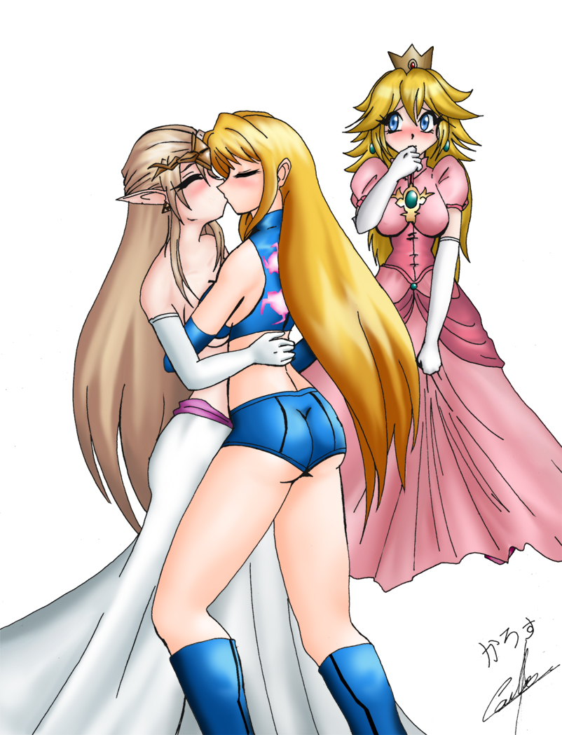 3girlsassblonde hairblushbreastsbrown hairclosed eyescrop topcrowndresselbow glovesgloveshair ornamentkisslong hairmidriffmultiple girlspink dresspointy earspuffy short sleevespuffy sleevesshort sleevessignaturesimple backgroundskirttopless femalewhite backgroundwhite gloveswhite skirtyuri