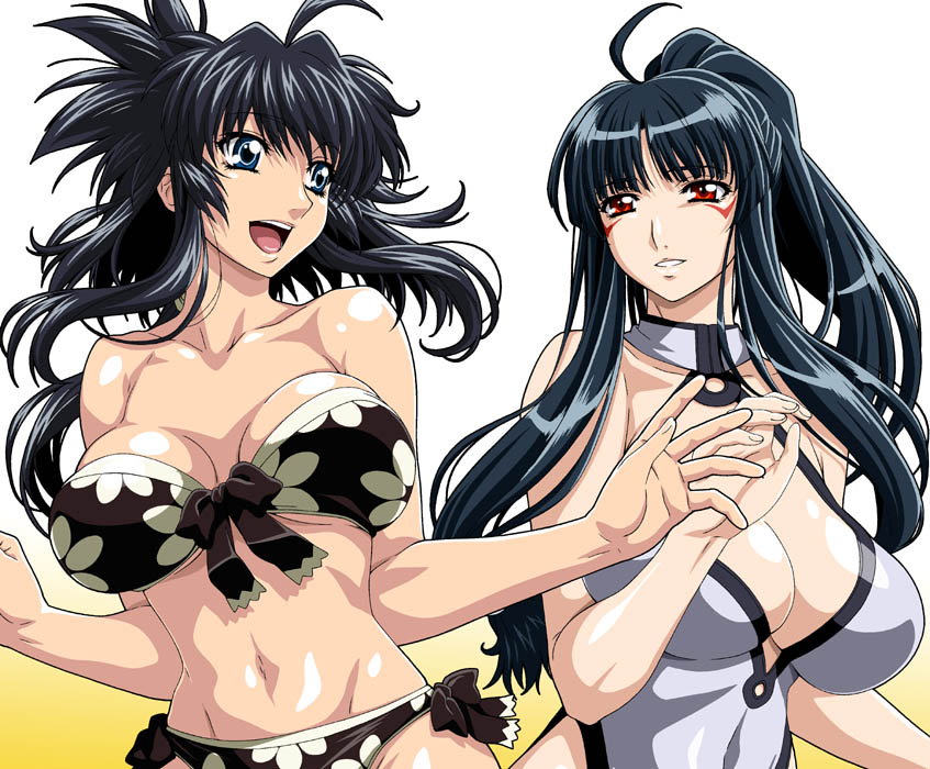 2girlsbikiniblack hairblue eyesbreastslarge breastslong hairmultiple girlsone-piece swimsuitponytailred eyesswimsuittattoo