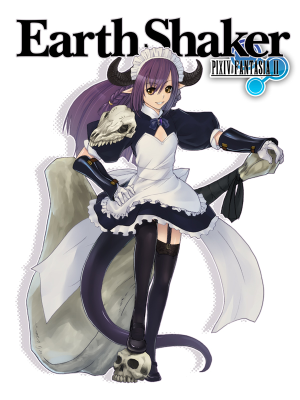 1girlbraidbrown eyesdemon girlfemale focusgarter belthornshuge weaponlegslong hairmaidpointy earspurple hairskullsolotailthighhighsweapon