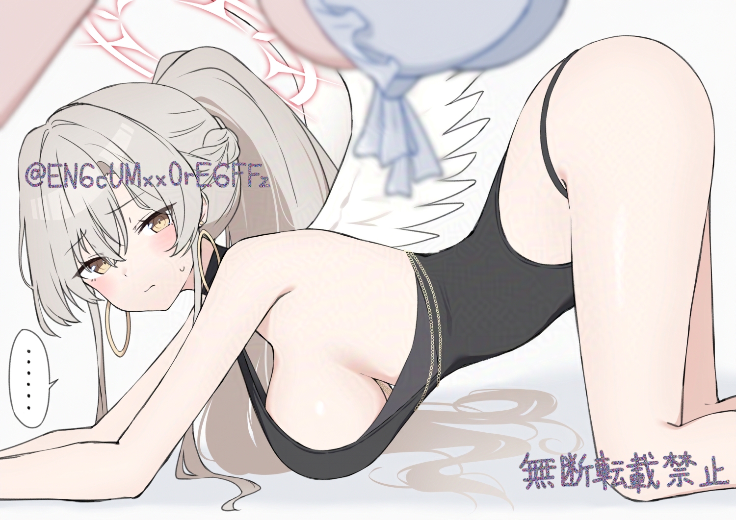 1boy2girlsangel wingsarm supportbare armsbare legsbare shouldersblack one-piece swimsuitblushbraidbreastsbrown haircleavageclosed mouthcopyright noticeearringsembarrassedfeathered wingsfeet out of framefurrowed browhair between eyeshair intakeshalf up braidhalohalterneckhigh ponytailhoop earringsjewelrylarge breastslong hairlooking at viewerlow wingsmultiple girlsofficial alternate costumeofficial alternate hairstyleon floorone-piece swimsuitpink haloponytailsimple backgroundsolo focusspeech bubblespoken ellipsisswimsuittop-down bottom-uptwitter usernamevery long hairwhite backgroundwhite wingswingsyellow eyes