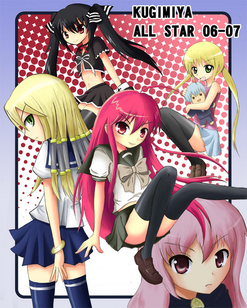 amaori renako, ouzuka mai, watashi ga koibito ni nareru wake naijan murimuri!, highres, official art, 2girls, :d, ashigaya high school uniform, black jacket, blonde hair, blu-ray cover, blue eyes, blush, bow, bowtie, braid, cardigan, cardigan around waist, clothes around waist, collared shirt, copyright name, cover, cowboy shot, dress shirt, finger heart, frilled skirt, frills, grey cardigan, grey skirt, hair intakes, hair ornament, hairclip, hand on another's waist, jacket, long hair, looking at viewer, multiple girls, open clothes, open jacket, open mouth, pink hair, plaid clothes, plaid skirt, pleated skirt, purple eyes, red bow, red bowtie, school uniform, shirt, short hair, skirt, smile, white shirt, x hair ornament