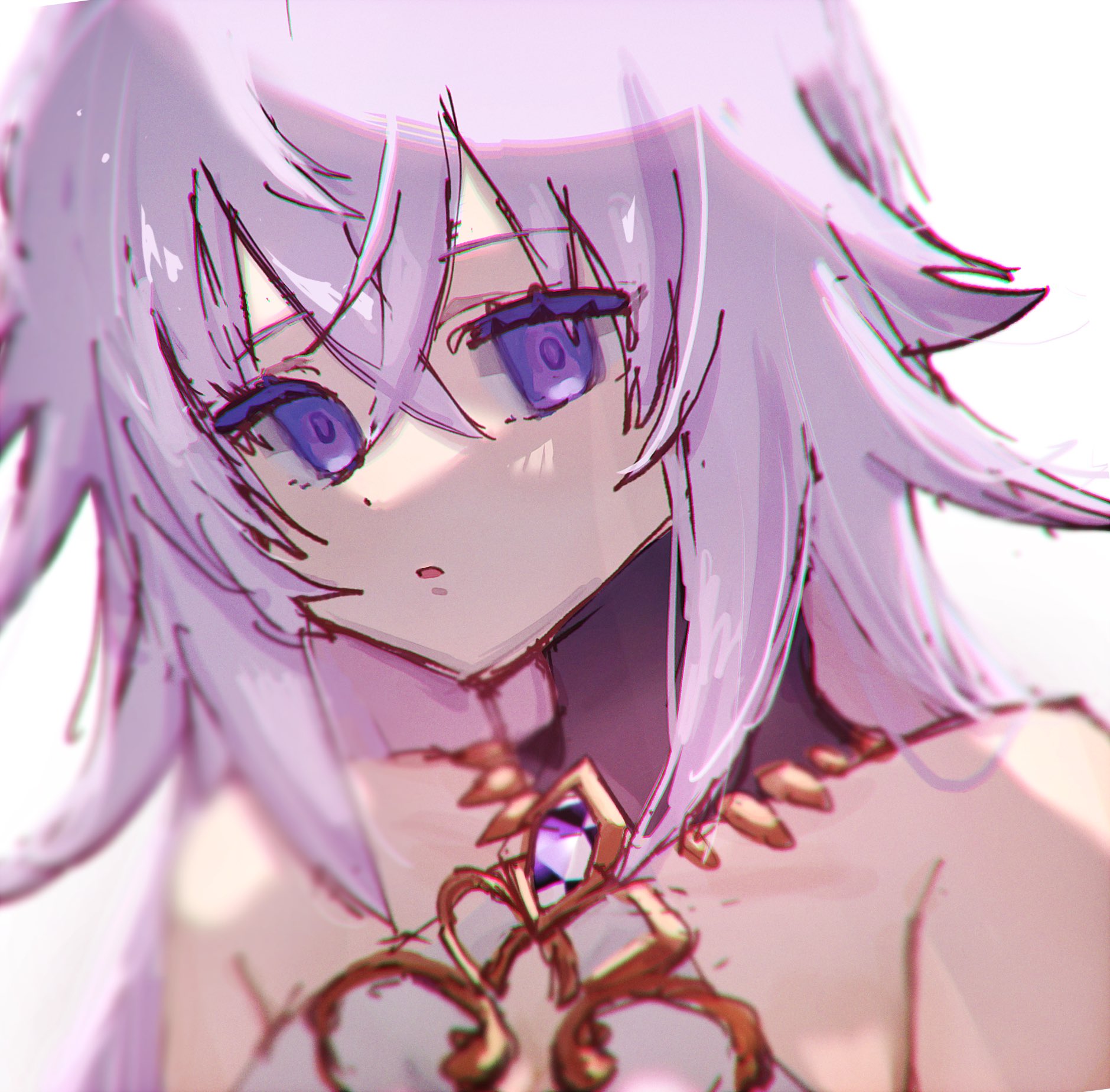 1girlbare shoulderslooking at viewerparted lipspurple eyespurple hairshisoteasimple backgroundsoloupper bodywhite background