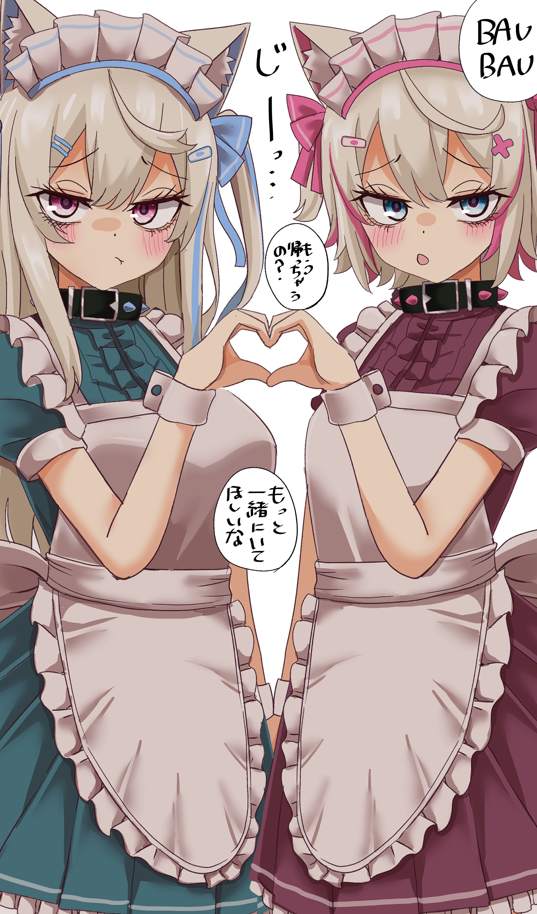 casyu nut, chitanda eru, ibara mayaka, hyouka, kyoto animation, absurdres, highres, 2girls, artist logo, bare arms, bare shoulders, bikini, black hair, blush, breasts, brown hair, cleavage, closed mouth, collarbone, logo, long hair, looking at viewer, medium breasts, multiple girls, navel, purple eyes, short hair, simple background, small breasts, smile, swimsuit, thighs, white bikini, yellow bikini