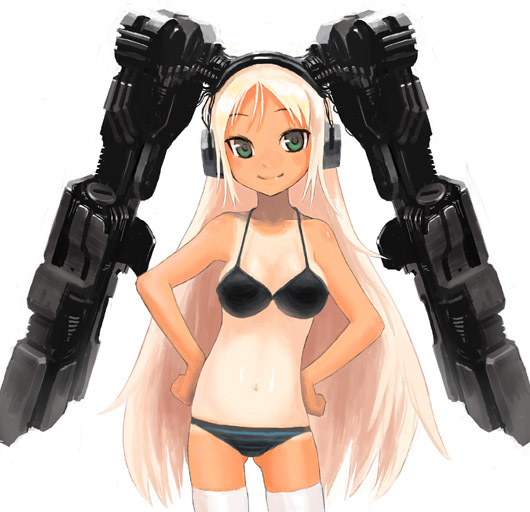 1girlarmorbikiniblack bikiniblonde haircowboy shotfemale focusgreen eyeshands on own hipshead tiltheadphoneslong hairlooking at viewermachineone-piece tansimple backgroundsmilesoloswimsuittantanlinethighhighstwintailswhite backgroundwhite thighhighs