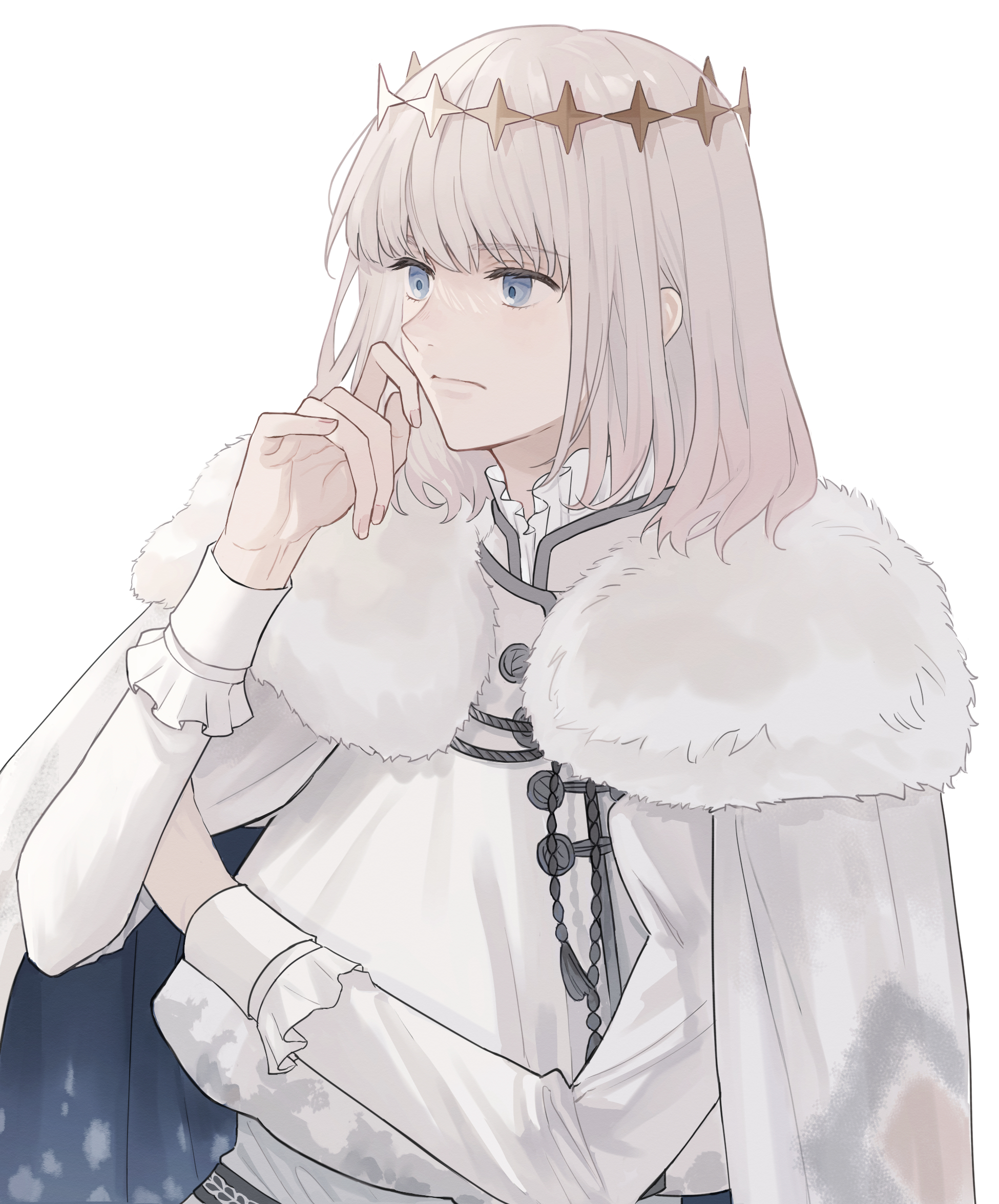 1boyblonde hairblue eyescloakdiamond hairbandfrownfur trimfur-trimmed cloaklooking aheadmale focussimple backgroundsoloupper bodywhite backgroundwhite cloak