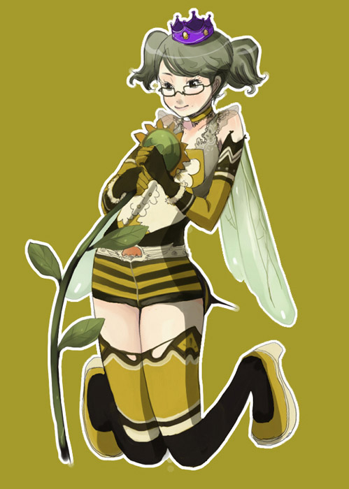 1girlarthropod girlbee girlcrownfemale focusflowerfull bodyglassesgreen hairhatinsect girlkneelinglegsmonster girlplantpurple crownshort hairsimple backgroundsolothighhighswings