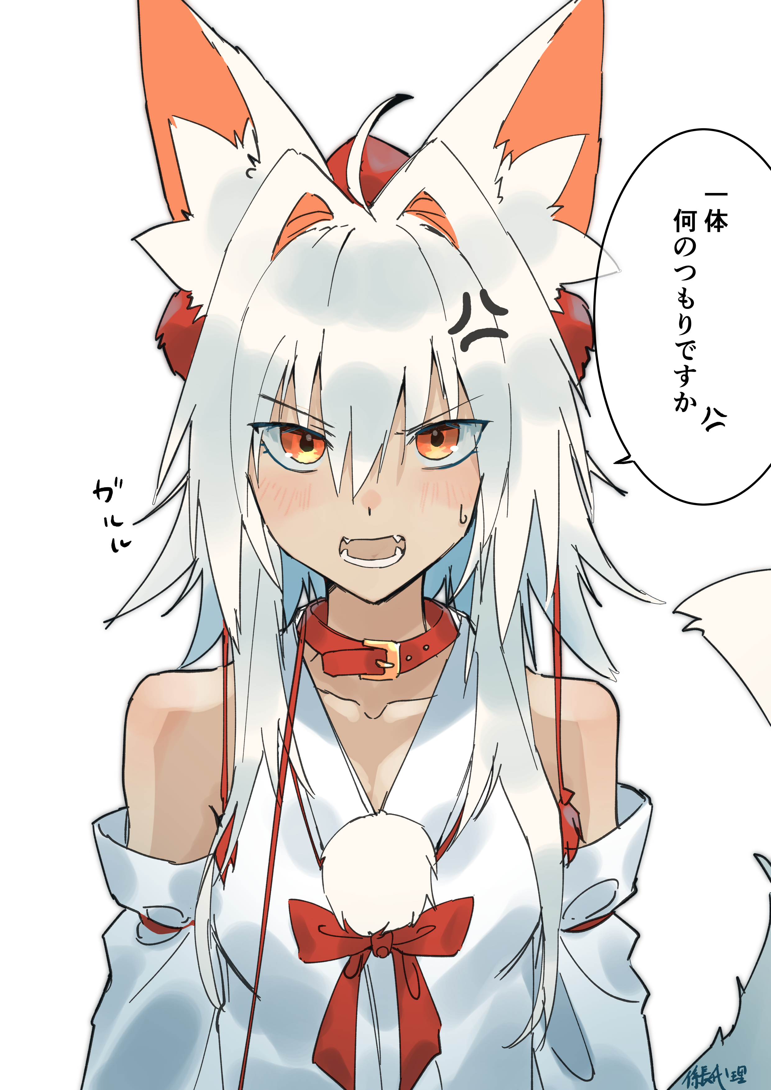1girlahogeanger veinangryanimal collaranimal ear fluffanimal earsartist nameblushbreastscleavagecollarcollarbonedetached sleevesgrey hairhatlooking at vieweropen mouthorange eyespom pom (clothes)red collarred hatsimple backgroundsolospeech bubblesweatdroptokin hatwhite backgroundwolf earswolf girl
