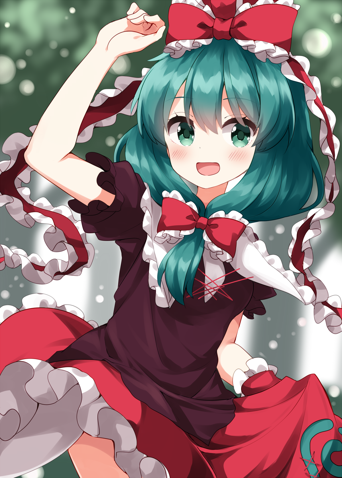 :d1girlarm upblurryblurry backgroundblushbowcowboy shotdressfrilled bowfrilled dressfrillsfront ponytailgreen eyesgreen hairhair bowlong hairlooking at vieweropen mouthred bowred dresssmilesolo