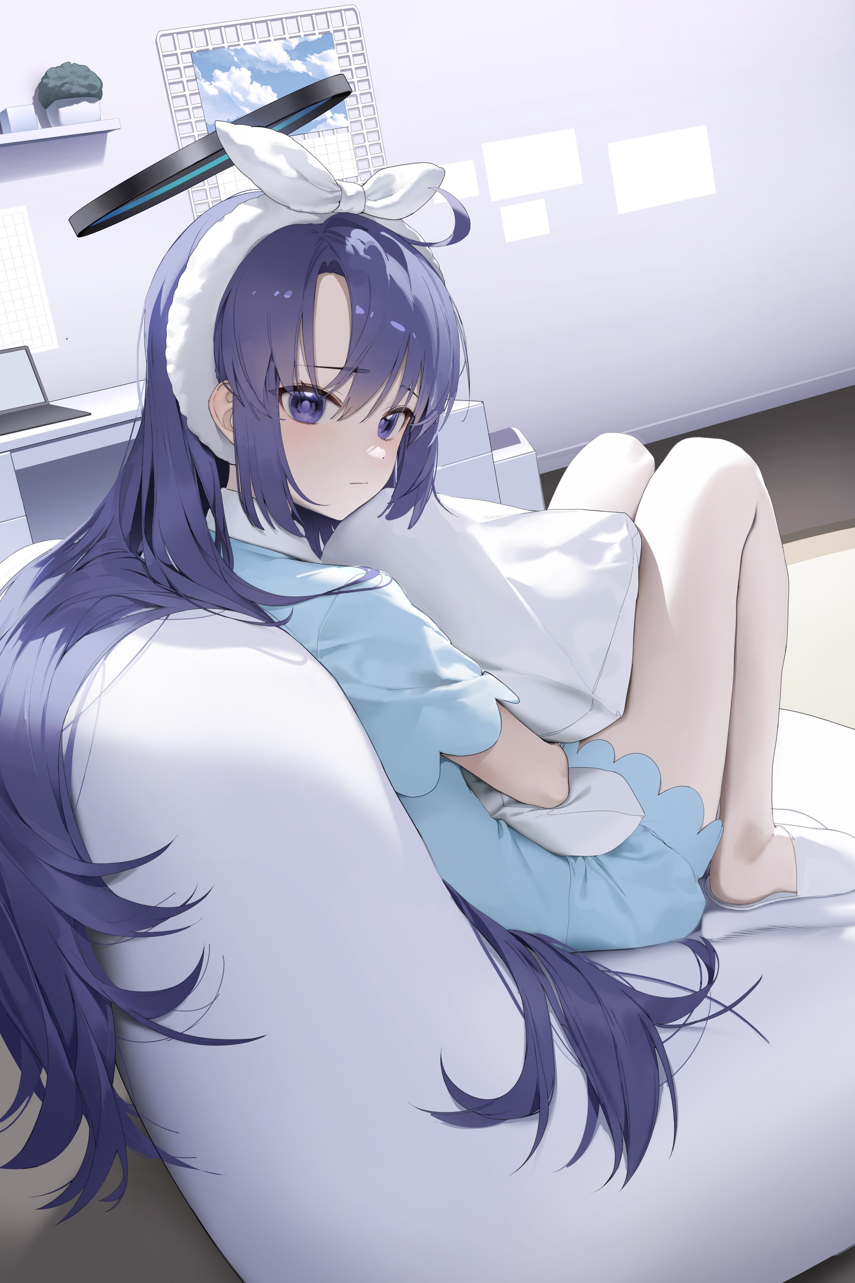 1boy1girlblack haloblue shirtbowbow hairbandclosed mouthdot nosefull bodyhairbandhalohugging objectindoorsknees uplong hairlooking at viewerofficial alternate costumepillowpurple eyespurple hairshirtsittingsolovery long hairwhite bowwhite hairband
