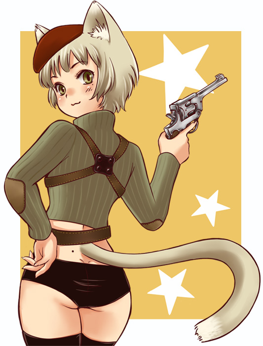 :31girlanimal earsassberetblushbrown hairfemale focusgunhandgunhatlooking backmolemole under eyerevolvershort hairsolotailthighhighsturtleneckweaponyellow eyes