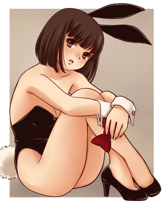 1girlanimal earsbare legsbrown eyesbrown hairfake animal earsfemale focushigh heelshugging own legsplayboy bunnyrabbit earsrabbit tailshoesshort hairsittingsolotail