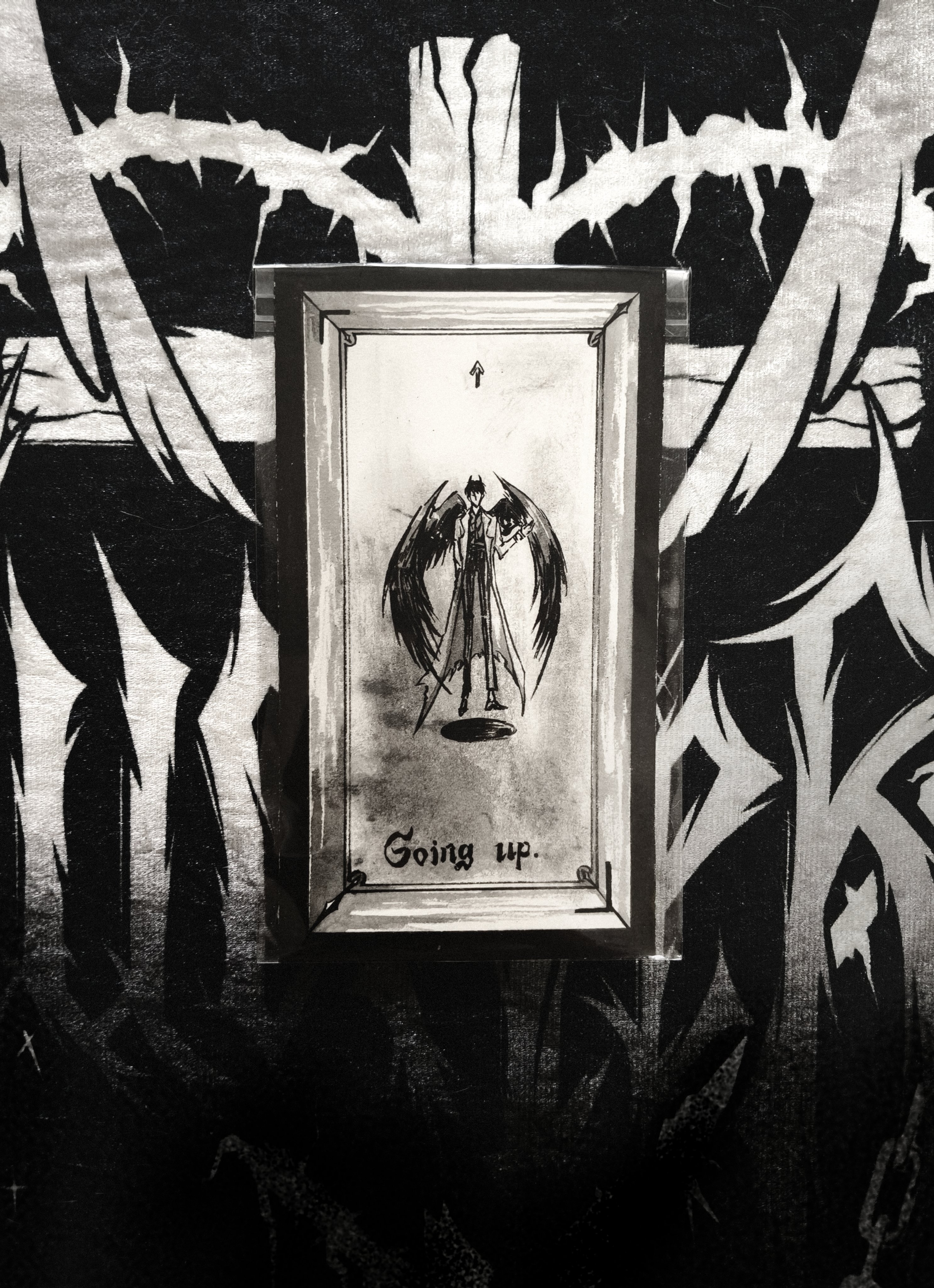shitodo aoji, shitodo hooaka, shitodo kuroji, len'en, artist request, commentary, english commentary, highres, photo (medium), second-party source, traditional media, 1girl, 3others, ^ ^, androgynous, ankle socks, arrow print, ascot, bare legs, black hair, black hat, black shirt, blue jacket, blush stickers, book, boots, brown capelet, capelet, chibi, closed eyes, closed mouth, coattails, collared shirt, cropped torso, crossed legs, dot nose, expressionless, frilled headwear, frilled shorts, frills, frown, green hair, green jacket, grey eyes, grey shorts, grey socks, hair between eyes, hand on own arm, happy, hat, heart, heart hands, heart hands quartet, holding, holding book, hood, hood down, hood up, hooded jacket, invisible chair, jacket, light frown, long hair, long sleeves, looking at viewer, mob cap, multiple others, multiple views, open book, open clothes, open jacket, other focus, puffy shorts, purple boots, purple eyes, purple jacket, reading, red hair, shirt, shitodo hoojiro, short hair, shorts, siblings, sidelocks, signature, single blush sticker, sitting, socks, tareme, triangular headpiece, white hair, yellow ascot, zipper