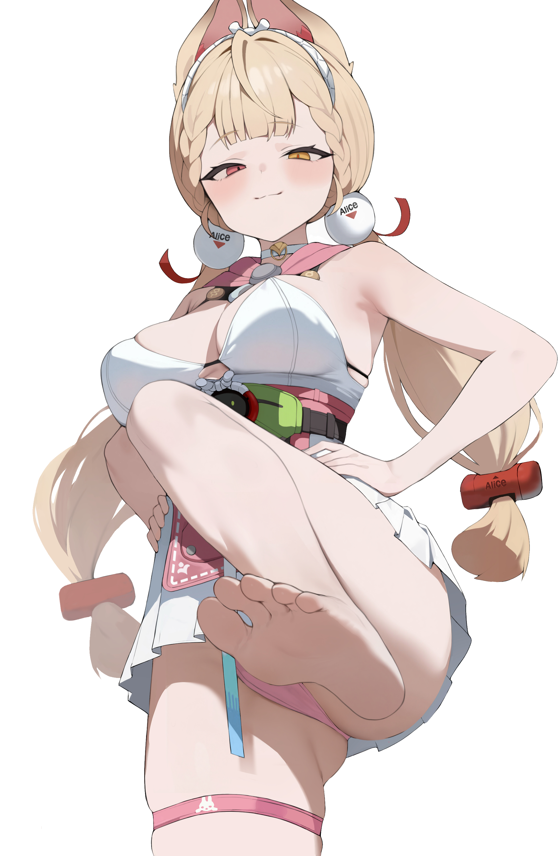:31girlanimal earsarmpitsbare armsbare legsbare shouldersbarefootbikinibikini under clothesblonde hairbreastscleavageclosed mouthcowboy shotdressfeethands on own hipsheterochromialarge breastsleg uplong hairlooking at viewerlow twintailsofficial alternate costumepink bikinirabbit earsred eyesshort dresssimple backgroundskindentationsmilesmugsolessolostandingstanding on one legswimsuitthigh strapthighstoestwintailswhite backgroundwhite dressyellow eyes