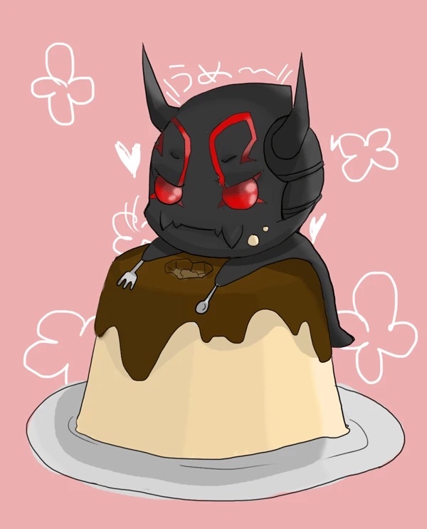 1boyblack bodysuitbodysuitchibicrumbsfoodfood on faceforkheartjapanese textmale focusmonstermonster boyonioni hornplatepuddingred eyesred markingssharp teethspoonteethutensils