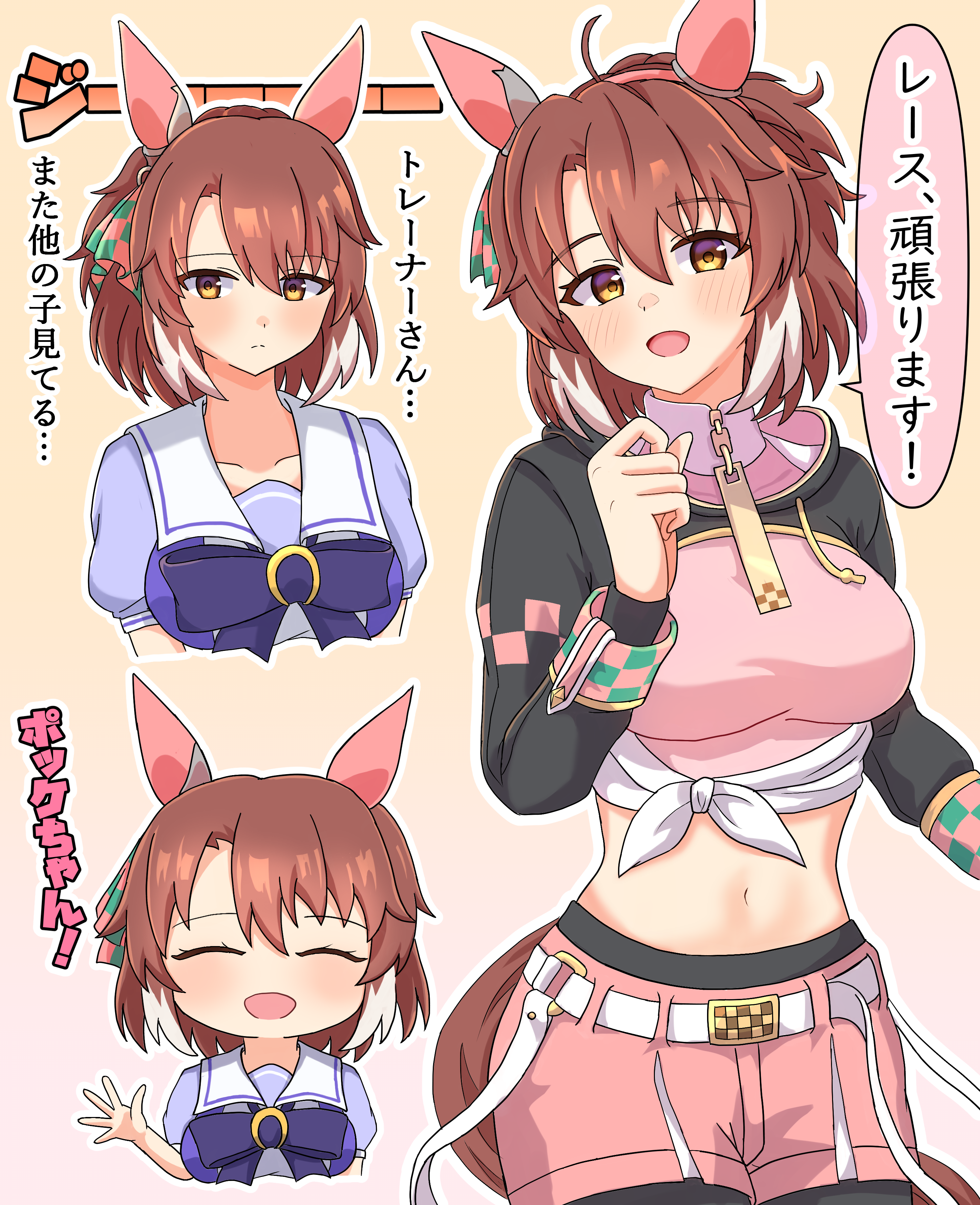 1boy1girlanimal earsblack pantyhoseblack shrugblushbowbowtiebreastsbrown eyesbrown hairchibichibi insetclosed eyesclosed mouthcrop topear covershorse earshorse girlhorse taillarge breastslong sleeveslooking at viewermedium hairmidriffmultiple viewsnavelopen mouthpantyhosepantyhose under shortspink shirtpink shortspurple bowpurple bowtiepurple shirtsailor collarschool uniformshirtshortsshrug (clothing)simple backgroundtailtracen school uniformwhite sailor collarwhite streaks