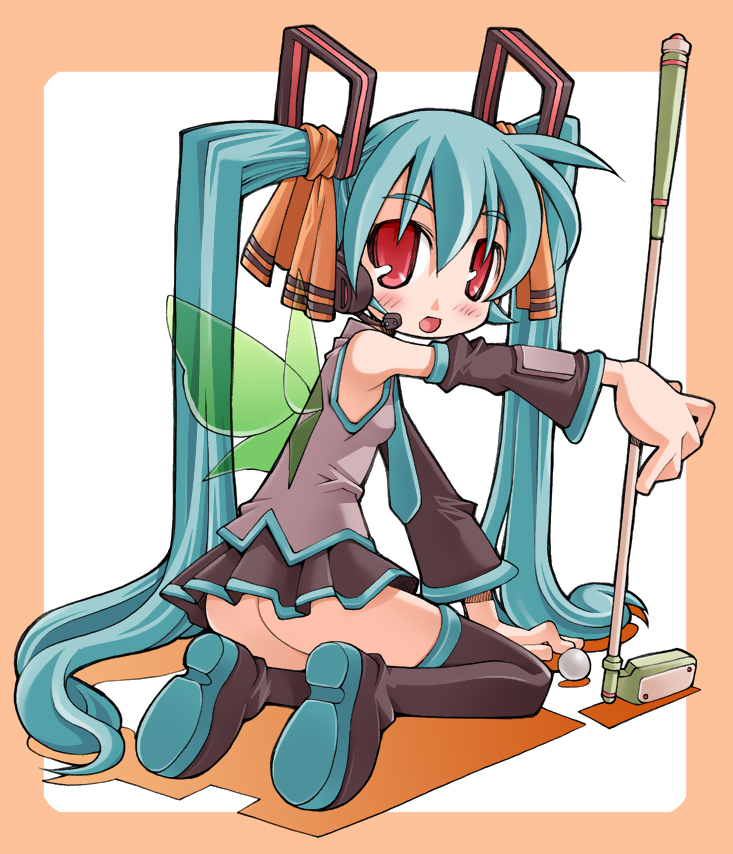 bootscosplaygolf clubgreen hairhatsune miku (cosplay)no pantiesred eyesribbonsolothighhighstwintailswings