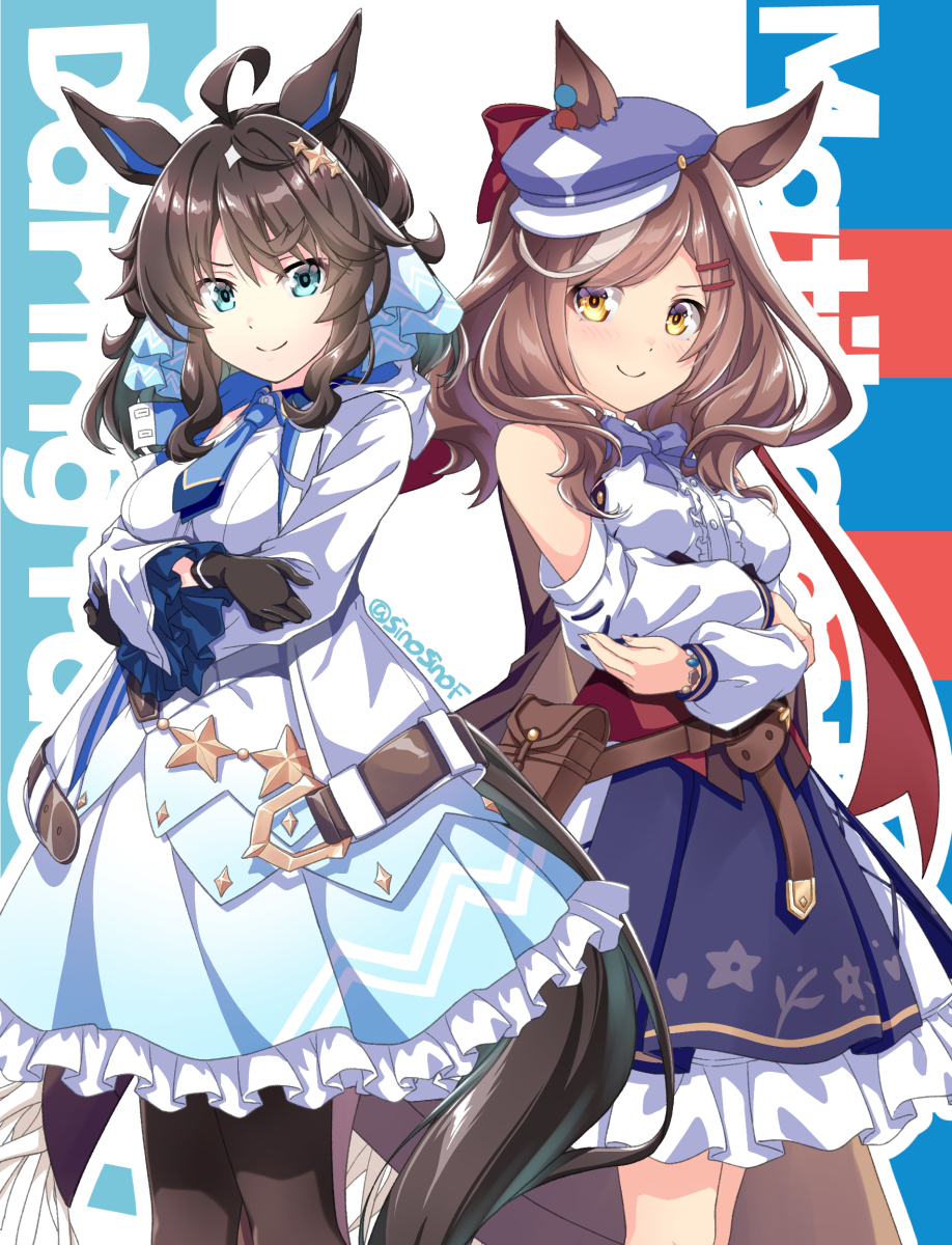 2girlsahogeanimal earsbeltblack hairblue eyesbreastsbrown haircharacter nameclothing cutoutcrossed armshair between eyeshair ornamenthaircliphathorse girljacketlooking at viewermedium breastsmultiple girlspantyhoseribbonshoulder cutoutsimple backgroundsmiletwitter username