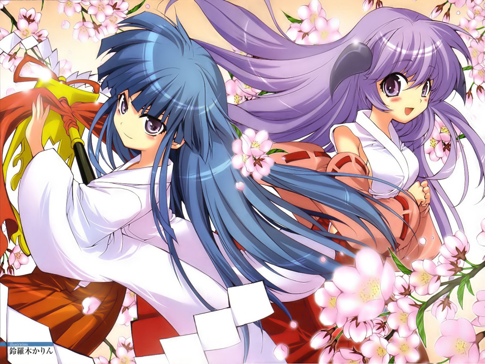 00sblack eyesblue haircherry blossomsflowergoheihornsjapanese clotheslong hairmikopurple eyespurple hair