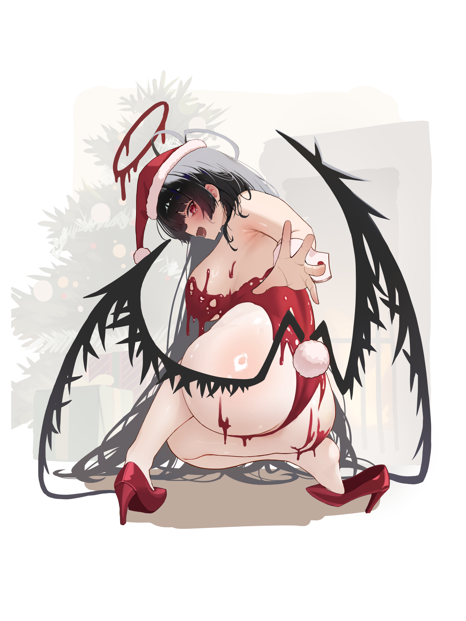 1girlassbare armsbare shouldersblack hairblack wingsblushbodypaintcommentary typofake tailfrom behindhalohathigh heelskneelinglong hairopen mouthplayboy bunnyrabbit tailred eyesred halored hatred shoessanta hatshoessolotailwingswrist cuffs