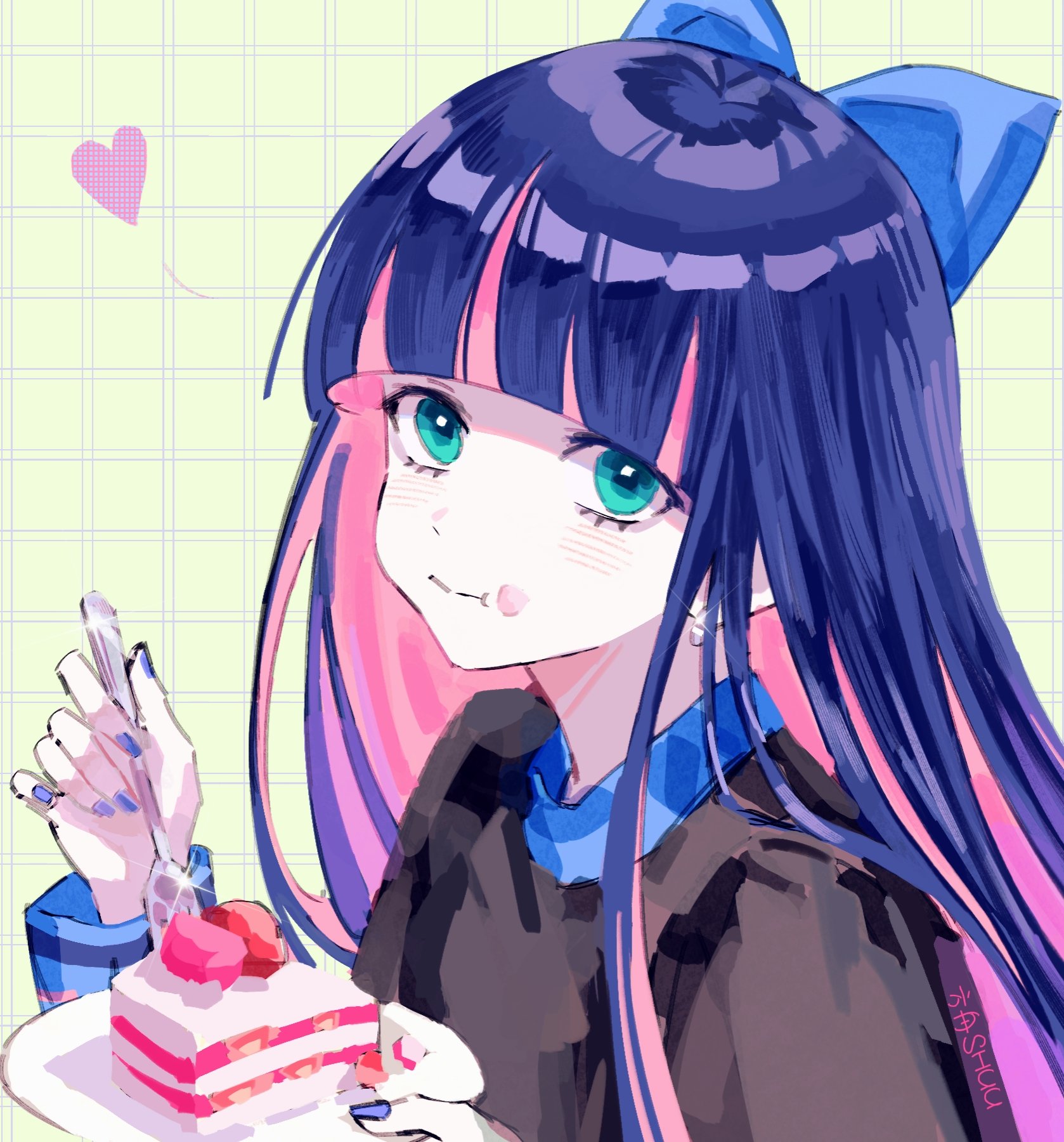 miu (angelo whitechoc), dooby (vtuber), indie virtual youtuber, absurdres, highres, 1girl, black hair, blonde hair, blue hat, blue overalls, blue sky, cloud, dooby (1st costume) (vtuber), gloves, green eyes, hat, looking at viewer, medium hair, mouse girl, mouse tail, multicolored hair, overalls, pointing, shirt, sky, solo, streaked hair, tail, teeth, train, train conductor, upper teeth only, virtual youtuber, white gloves, white shirt