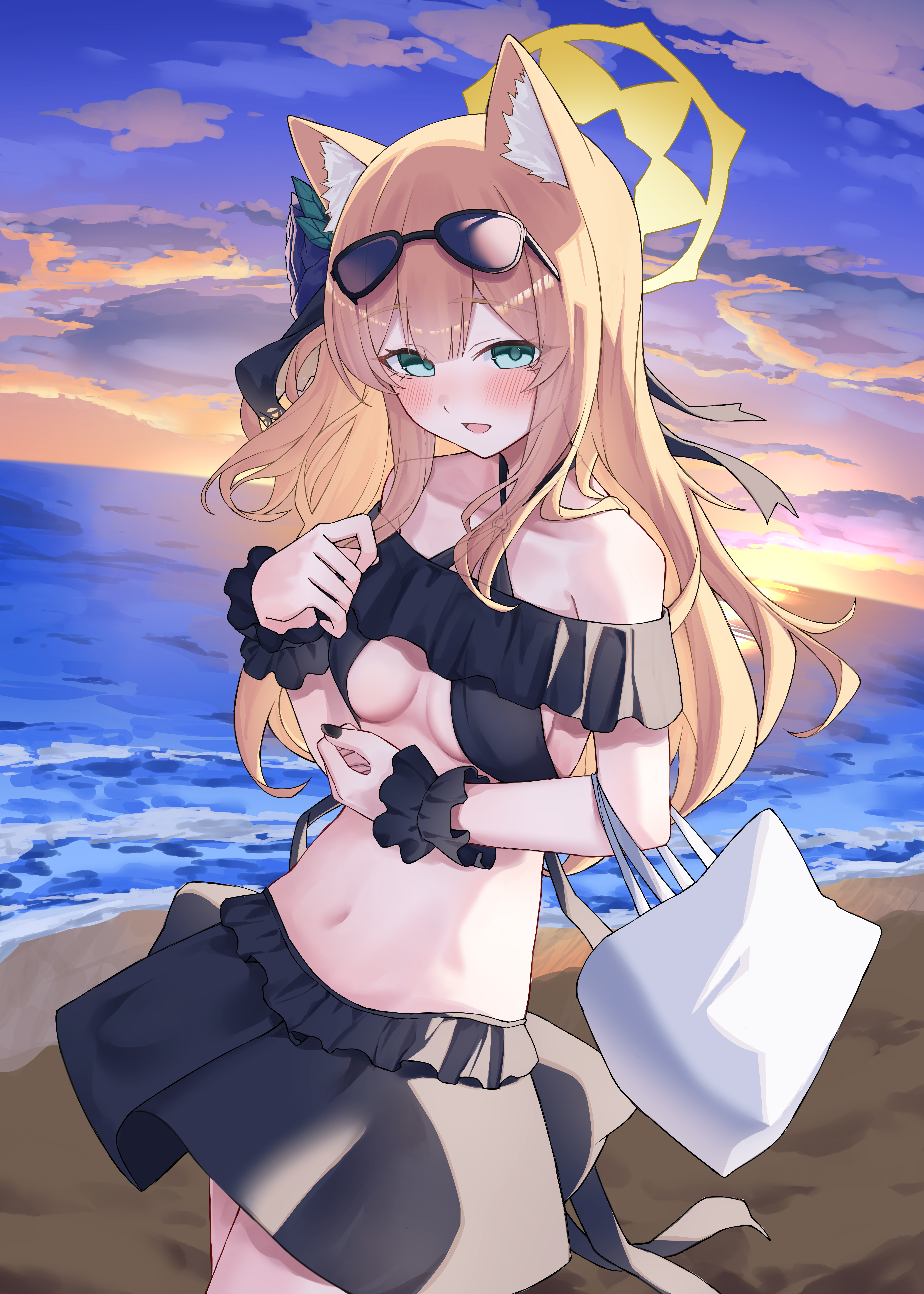 1girlalternate costumeanimal ear fluffanimal earsbagbare shouldersbeachbikinibikini top onlyblack nailsblack skirtblue eyesblushbreastscat earscat girleyewear on headflowerfrilled bikinifrillshair flowerhair ornamenthaloholdingholding baglong hairlooking at viewernaveloceanoff shoulderoff-shoulder bikiniopen mouthorange hairpurple flowerskirtsolostomachsunglassesswimsuitwhite bagwrist cuffsyellow halo
