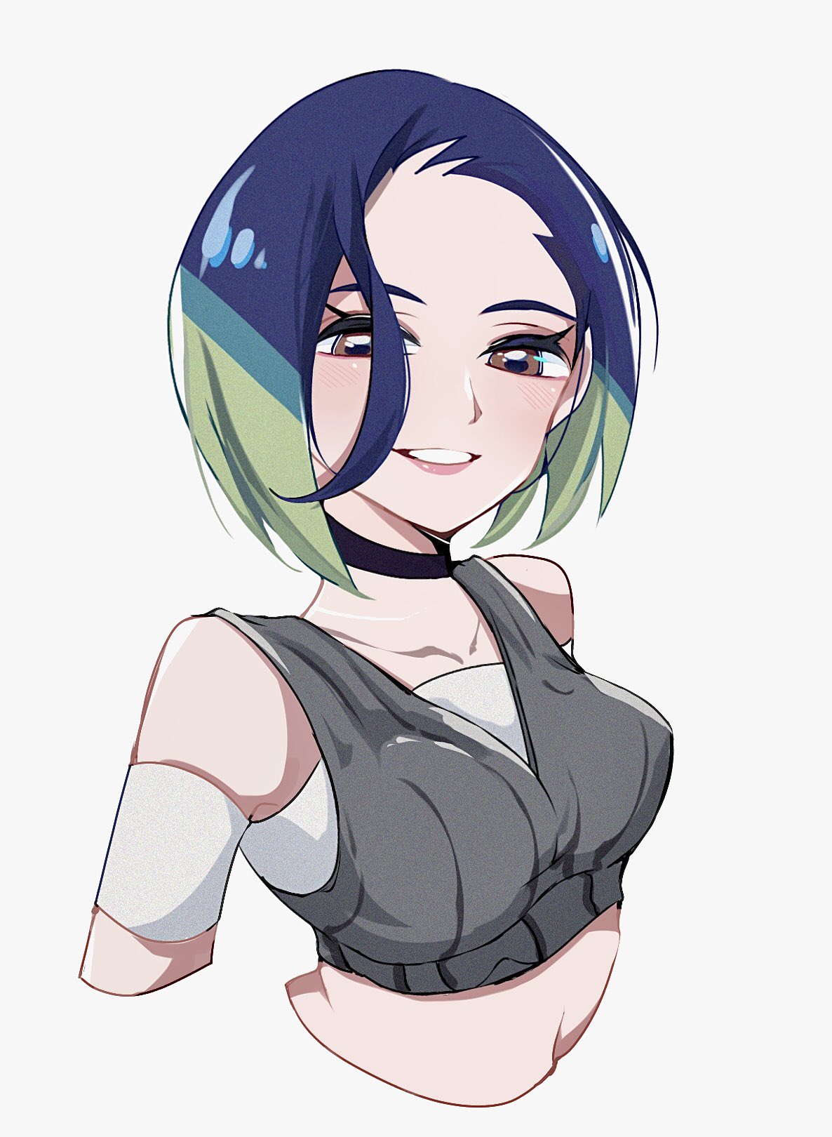 1girlbare shouldersblack chokerblue hairbob cutbreastsbrown eyeschokercollarbonecrop topgradient hairgrey shirtgrey sports bragrinlooking at viewerloose hair strandmedium breastsmidriffmulticolored hairoff shoulderoff-shoulder shirtopen mouthribbed shirtshirtshort hairsimple backgroundsleevelesssleeveless shirtsmilesports braundershirtupper bodywhite background