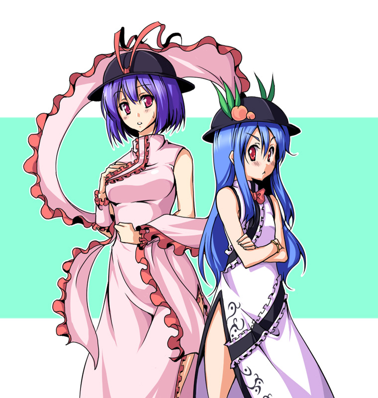 :o1boy2girlsalternate costumebare shouldersblue hairblushchina dresschinese clothescrossed armsdressfemale focusfoodfruithatlong hairmultiple girlspeachpurple hairribbonshawlshort hairside slitsimple background
