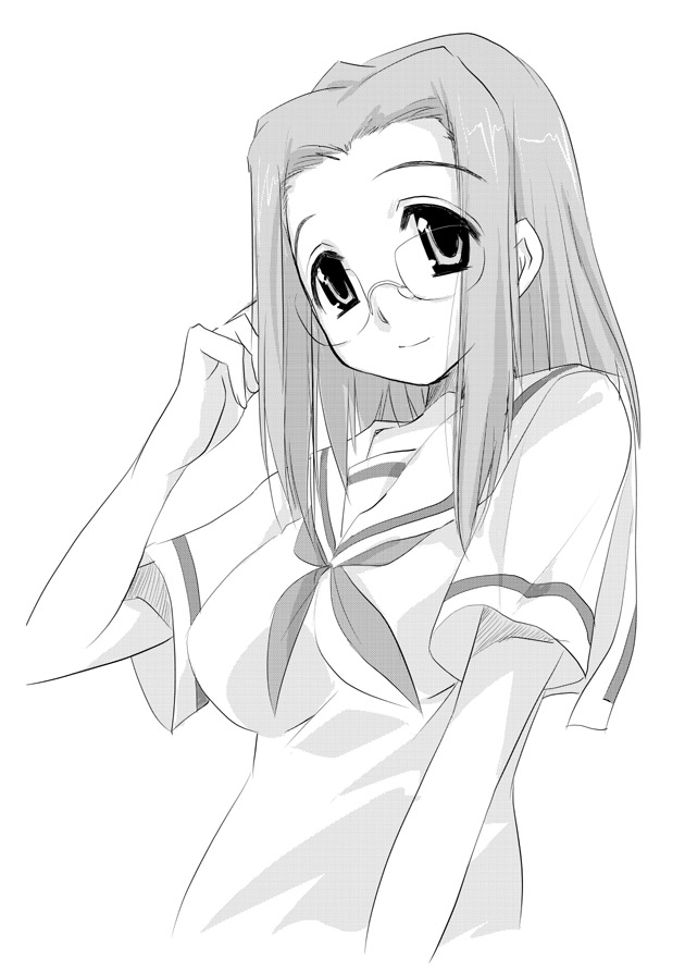 00s1girlfemale focusglassesgreyscalelong hairmonochromeneckerchiefsailor collarschool uniformshirtshort sleevessmilesoloupper body