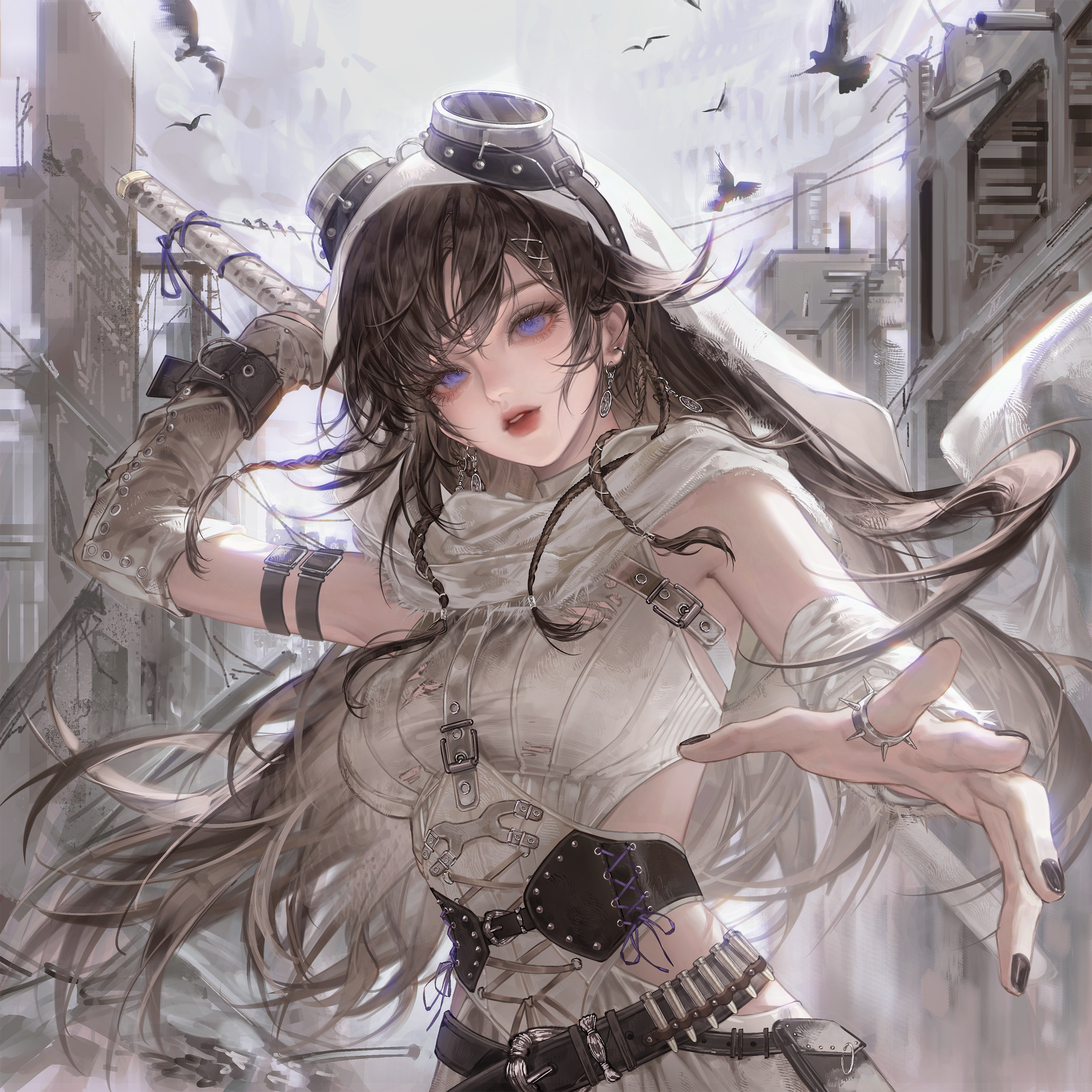 1girlbandaged armbandagesbeltbirdblack hairblack nailsblue eyesbreastsbrown hairbuildingcorsetearringsgogglesgoggles on headhair ornamentholdingholding weaponjewelrylong hairlooking at viewernail polishopen mouthoutdoorspurple eyesringscarfsoloswordupper bodyweapon