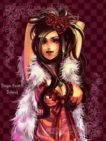 1girlarmpitsblack hairblue eyesbreastscleavagedressflowerlarge breastslong hairmolemole under eyerose