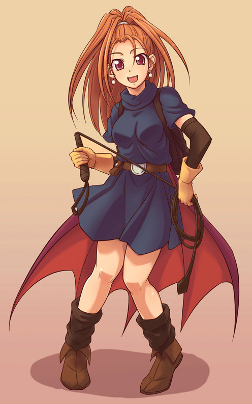 1girlbootscapedressearringselbow glovesfemale focusforeheadgloveshigh ponytailjewelryponytailred eyesred hairsmilesolowhip