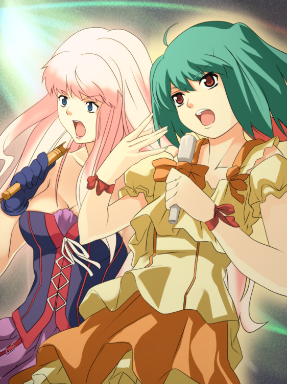 :o00s2girlsblue dressblue eyescollarbonedressgreen hairholdinglayered dressmicrophonemultiple girlsopen mouthpink hairpuffy short sleevespuffy sleevesshort hairshort sleevessurprisedyellow dress