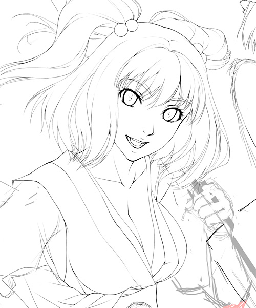 1girlfemale focusgreyscalehair bobbleshair ornamentjapanese clotheskimonolineartmonochromesketchsmilesolotwintailstwo side up