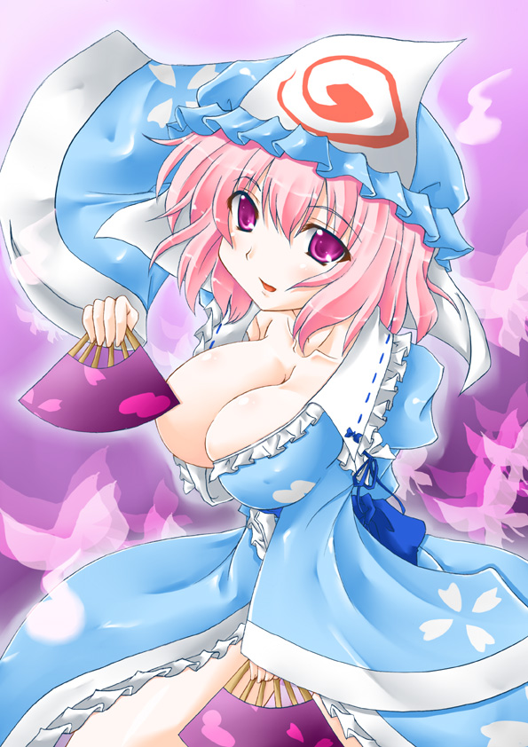 1girlbreastscleavagefemale focusghosthand fanhatjapanese clotheskimonolarge breastspink hairribbonshort hairsolo