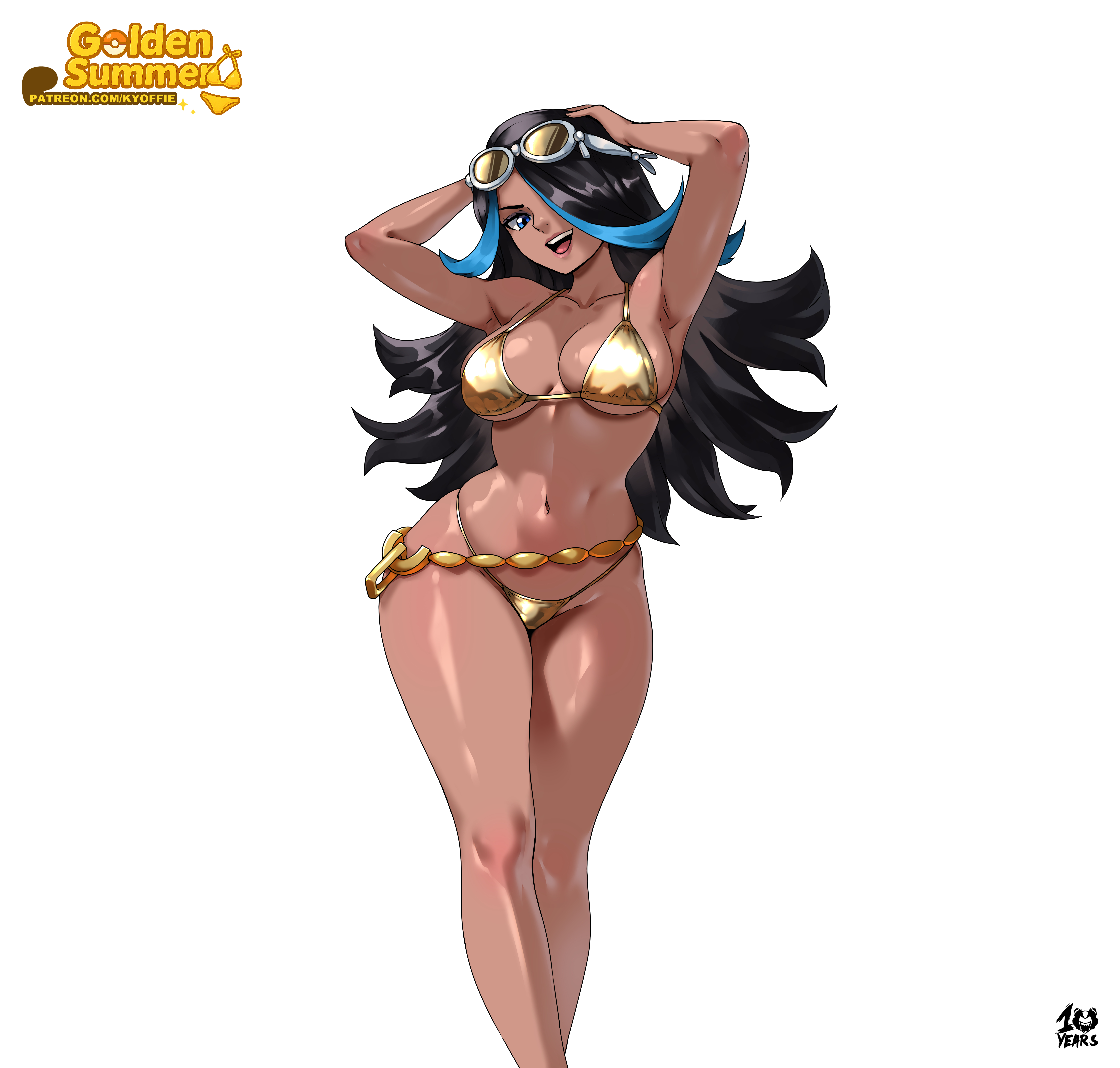 1girlartist namebikiniblack hairblue eyesblue hairbreastscollarboneeyewear on headfeet out of framegold bikinihair over one eyehands on own headlarge breastsmulticolored hairnavelopen mouthpatreon usernamesimple backgroundsmilesolostreaked hairsunglassesswimsuitteethtinted eyewearupper teeth onlywhite backgroundwhite-framed eyewearyellow-tinted eyewear