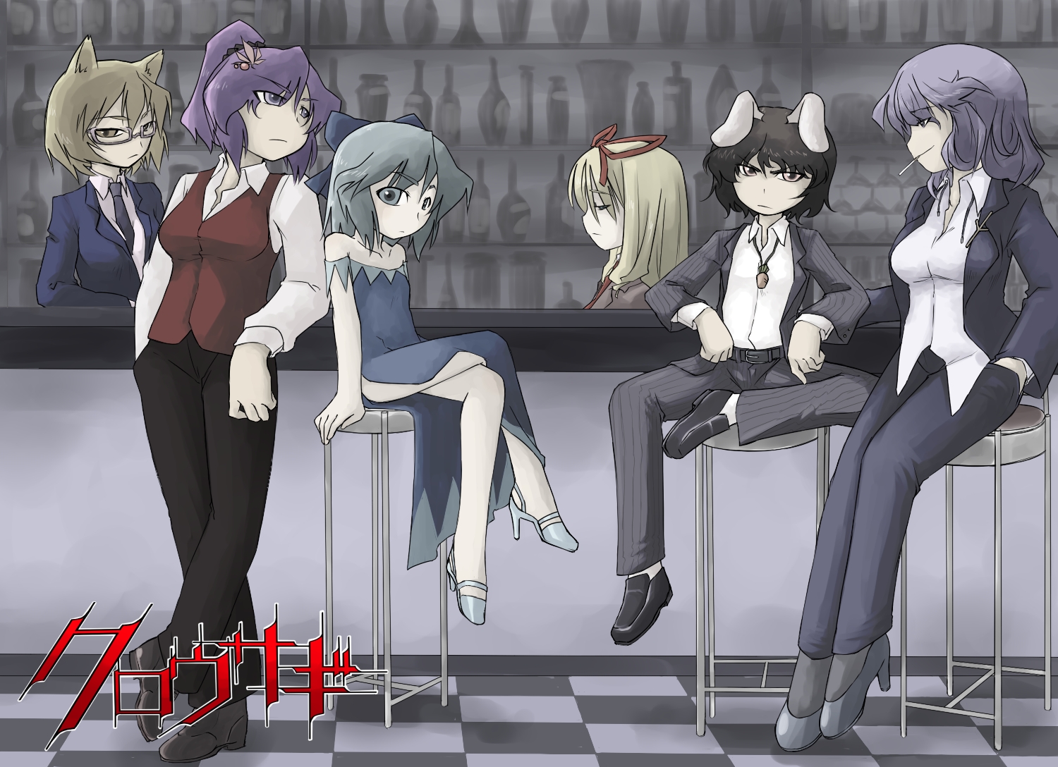 6+girlsalternate costumeanimal earsbar (place)bar stoolblonde hairblue dressblue eyesblue hairbottlecarrot necklacecheckered floorcontemporarydressfemale focusformal clothesfox earsfrownglasseshands in pocketshigh heelsjacketjewelryloaferslong hairlong sleeveslooking at viewermultiple girlsnecklacenecktieopen clothesopen jacketpantspinpinstripe patternpinstripe suitponytailpurple eyespurple hairrabbit earsseriousshoesshort hairsittingsleevelesssleeveless dressstoolstraplessstrapless dresssuitvestwaistcoatyellow eyes