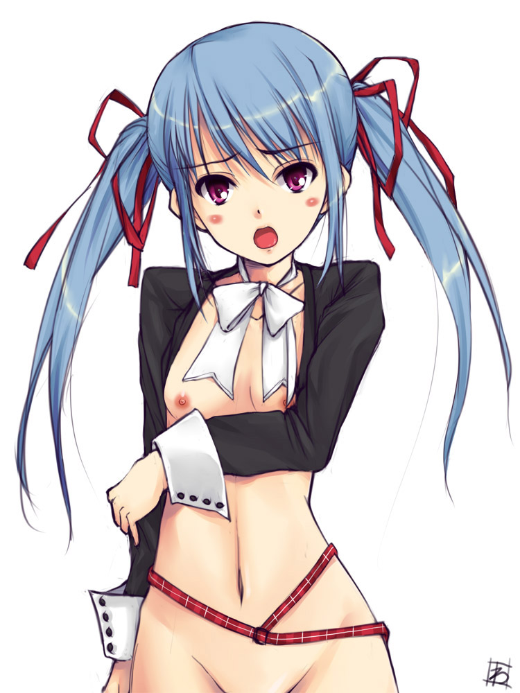 10s1girlbeltblue hairblushbottomlessbowbreastsfemale focusflat chestgroinhair ribbonlong hairopen mouthpink eyespurple eyesribbonsolotwintails