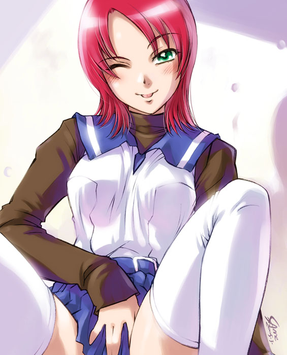 00s1girlblushfemale focusgreen eyesone eye closedred hairschool uniformserafukushort hairsolothighhighstonguewhite thighhighswink