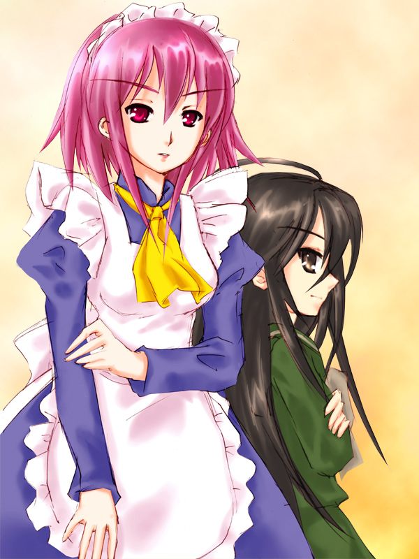 00sback-to-backblack hairbrown eyeslong hairmaidpink eyespink hairschool uniformserafukushort hair