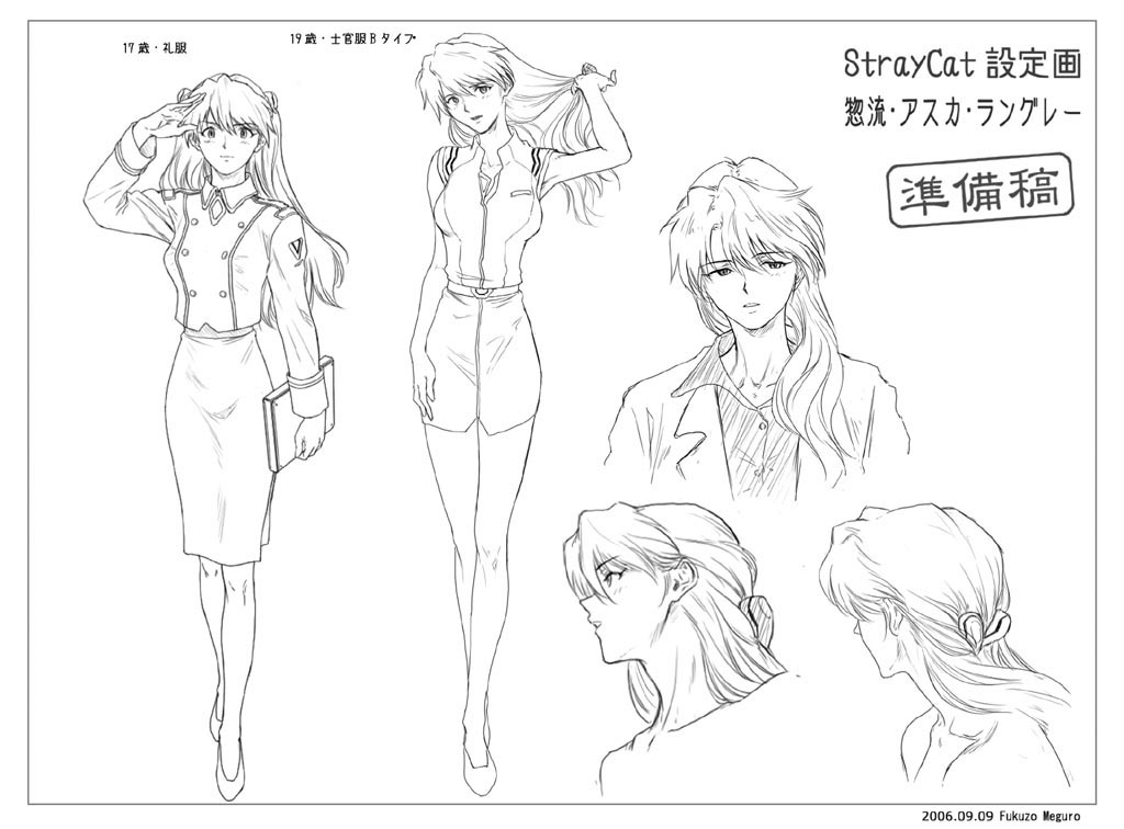1girl2006age progressionaged upalternate hairstylebreastsdatedfull bodygreyscalehigh heelsinterface headset (evangelion)lineartlong hairlooking at viewerminiskirtmonochromeofficial stylepencil skirtpumpsreference sheetsalutesimple backgroundskirtstandingwhite background