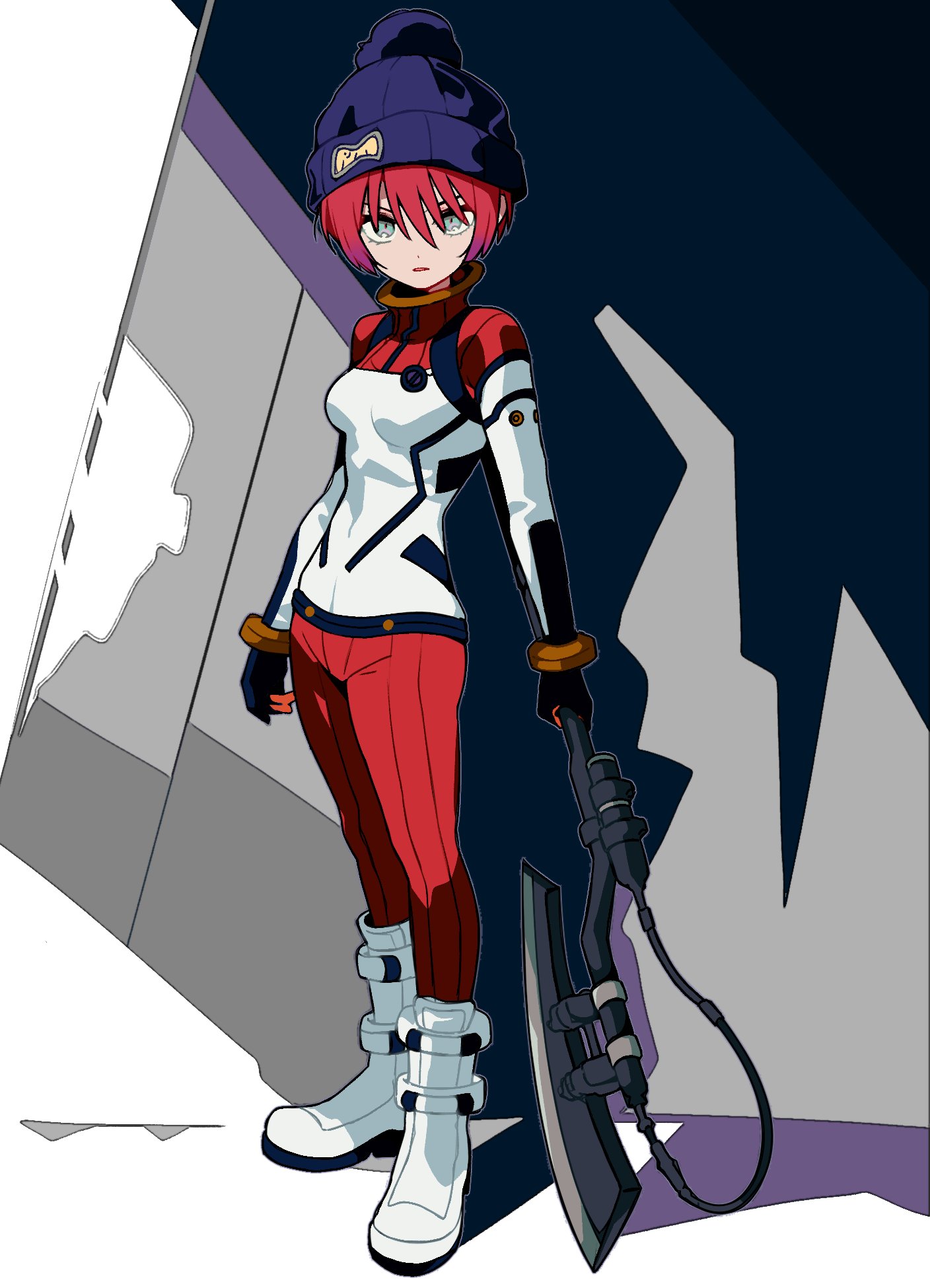 1girlaqua eyesaxebeaniebodysuitbreastshatheat hawkholdingholding axelooking at viewermecha pilot suitmulticolored bodysuitopen mouthred hairscience fictionshort hairsolo