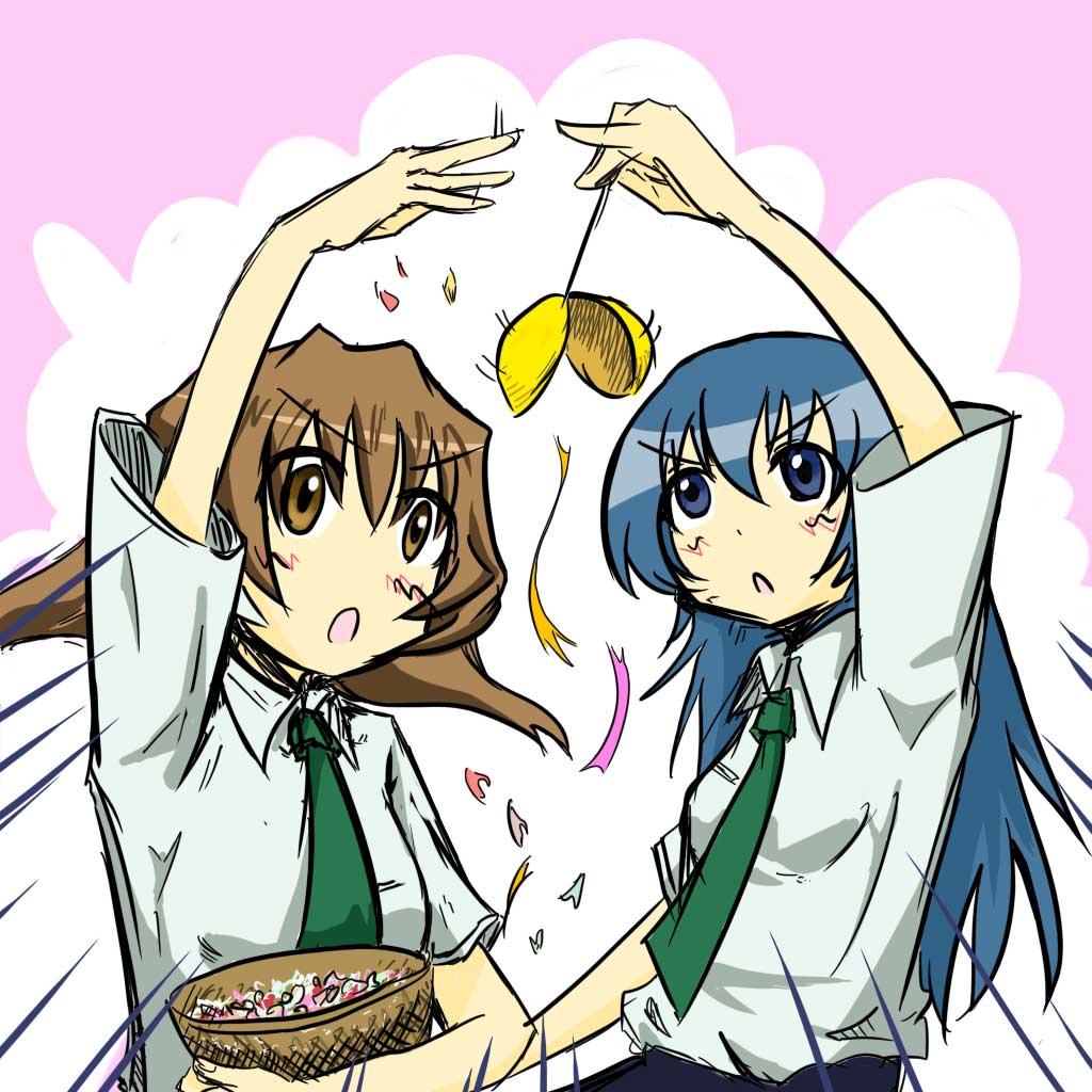 :o00s2girlsblue eyesblue hairbowlbrown eyesbrown hairconfettigreen necktieholdingmultiple girlsnecktieparted lips