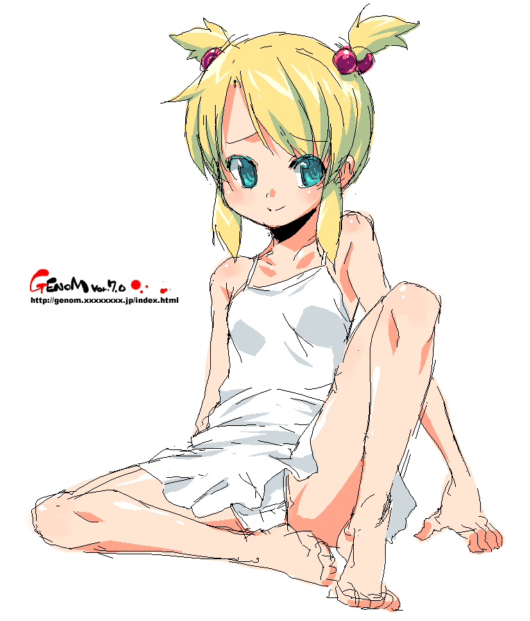 1girlbarefootblonde hairblue eyesbreastsfeetfemale focusflat chestoekakishysittingsmall breastssmilesolo