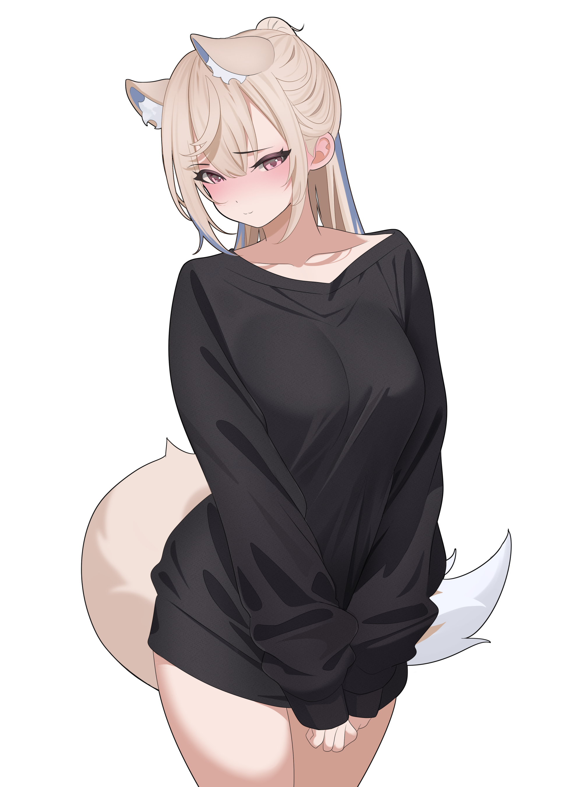 1girlanimal ear fluffanimal earsblack sweaterblonde hairblue hairblushbreastscollarbonecowboy shotcrossed bangsdog earsdog girldog taildouble-parted bangsextra earshair between eyeshigh ponytaillarge breastslong hairlong sleeveslooking at viewermulticolored hairno pantspink eyesponytailpuffy long sleevespuffy sleevessimple backgroundsleeves past wristssolostandingstreaked hairsweatertailvirtual youtuberwhite backgroundwide ponytail