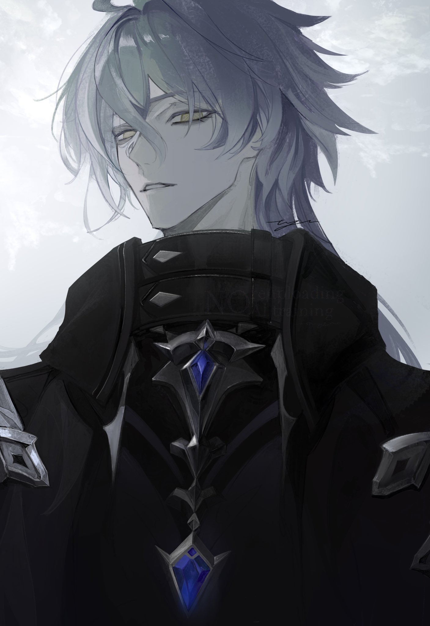 1boyantenna hairblack coatblue gemstoneblue haircoatcrossed bangsdouble-parted bangsempty eyesgemlong hairmale focusparted lipssoloteethupper bodyyellow eyes