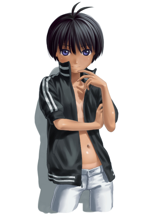 00s1girlandrogynousantenna hairbikini tanblack hairblue eyesdenimfemale focusjacketjeanslight smilelooking at viewermidriffnavelno braopen clothesopen shirtpantsreverse trapshiny skinshirtshort hairsimple backgroundsolotantanlinewhite background