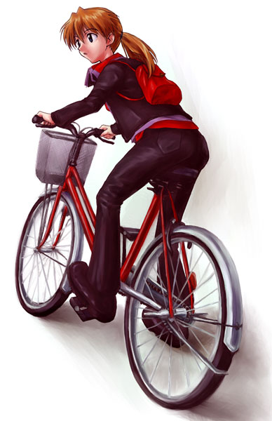 1girlalternate hairstylebackpackbagbicycleblack eyesblack jacketblack pantsbrown haircruiser bicyclefemale focusfrom behindjacketlong hairlong sleeveslooking to the sidepantsponytailrandoserured hairsolowhite background