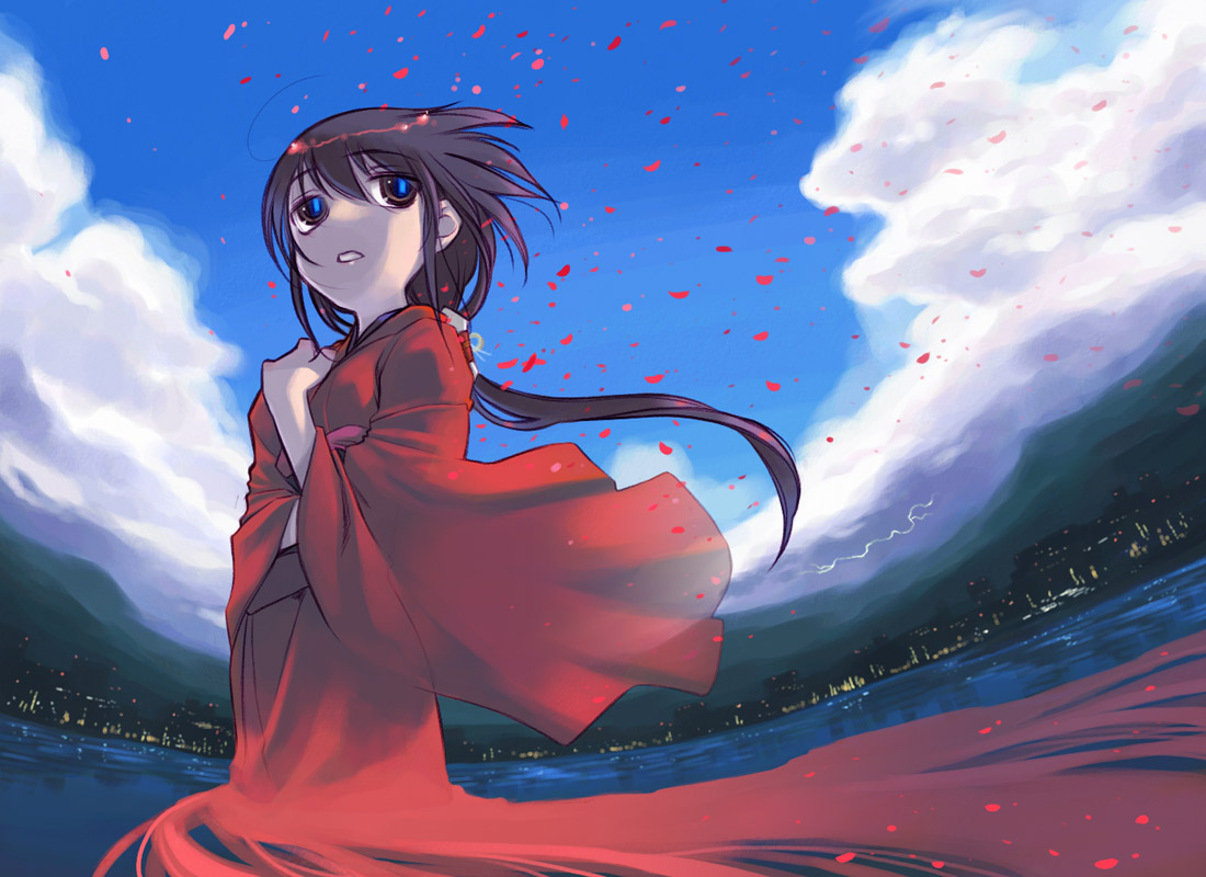 1girlcherry blossomscityclouddayfemale focusfisheyejapanese clotheskimonolightninglong hairlooking uppetalsponytailreflectionskyskylinesolowadingwater