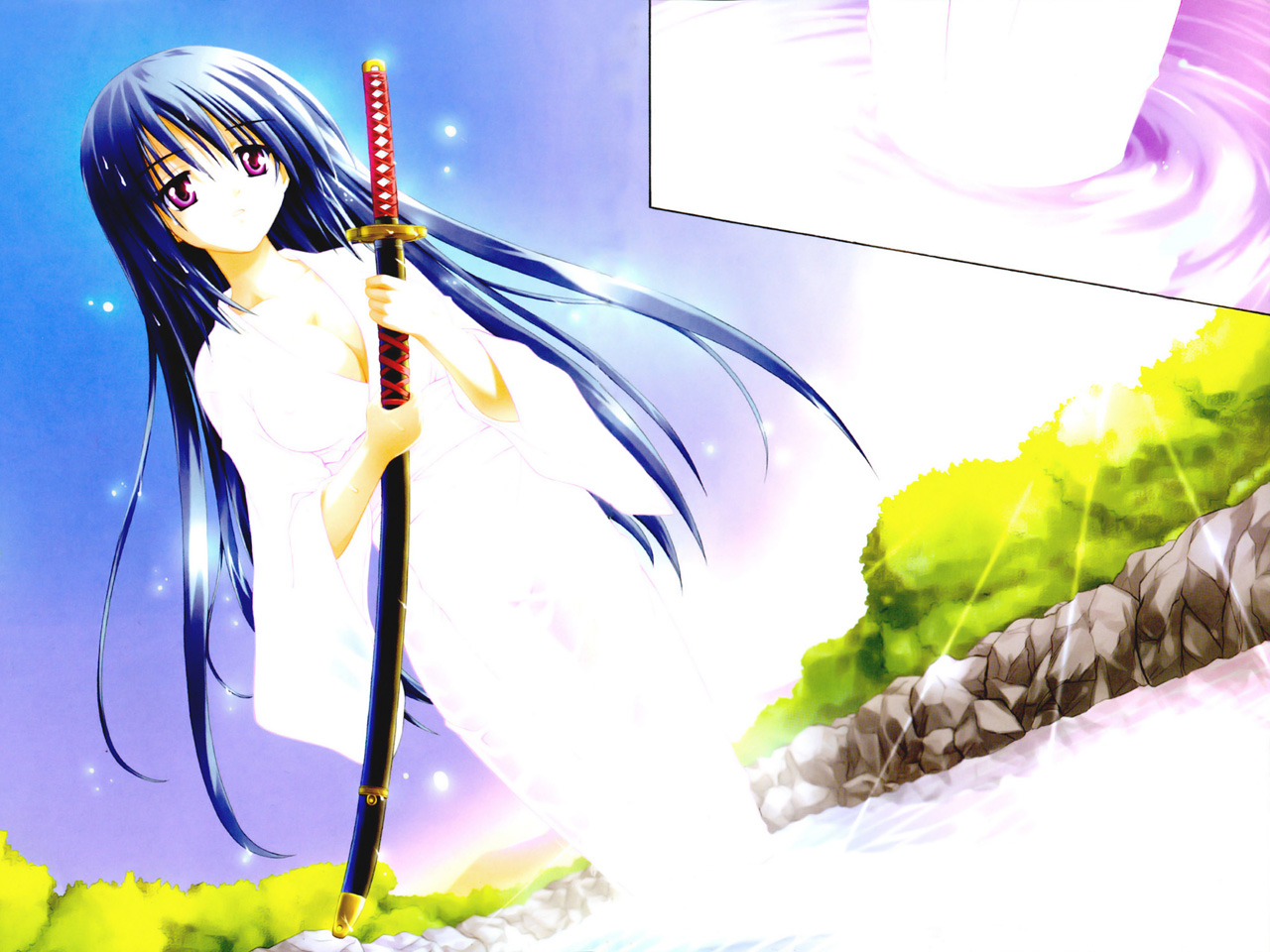 1girlblue hairbreastsfemale focusjapanese clotheskimonolong hairmedium breastspurple eyessoloswordwaterweapon